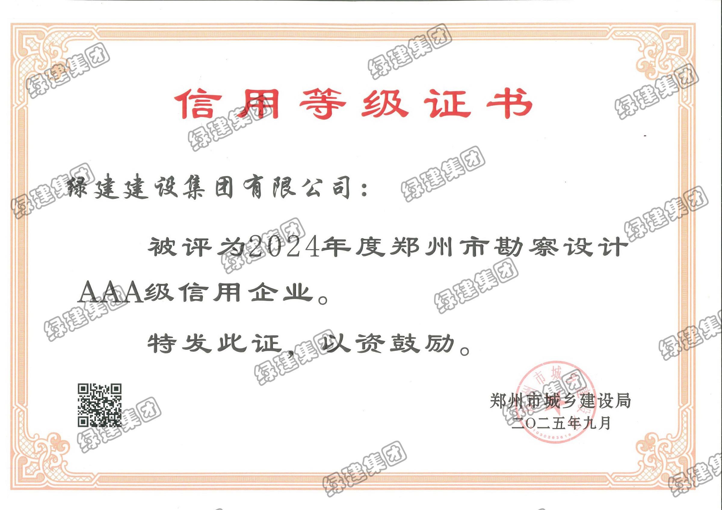 2024年度鄭州市勘察設計AAA級信用企業