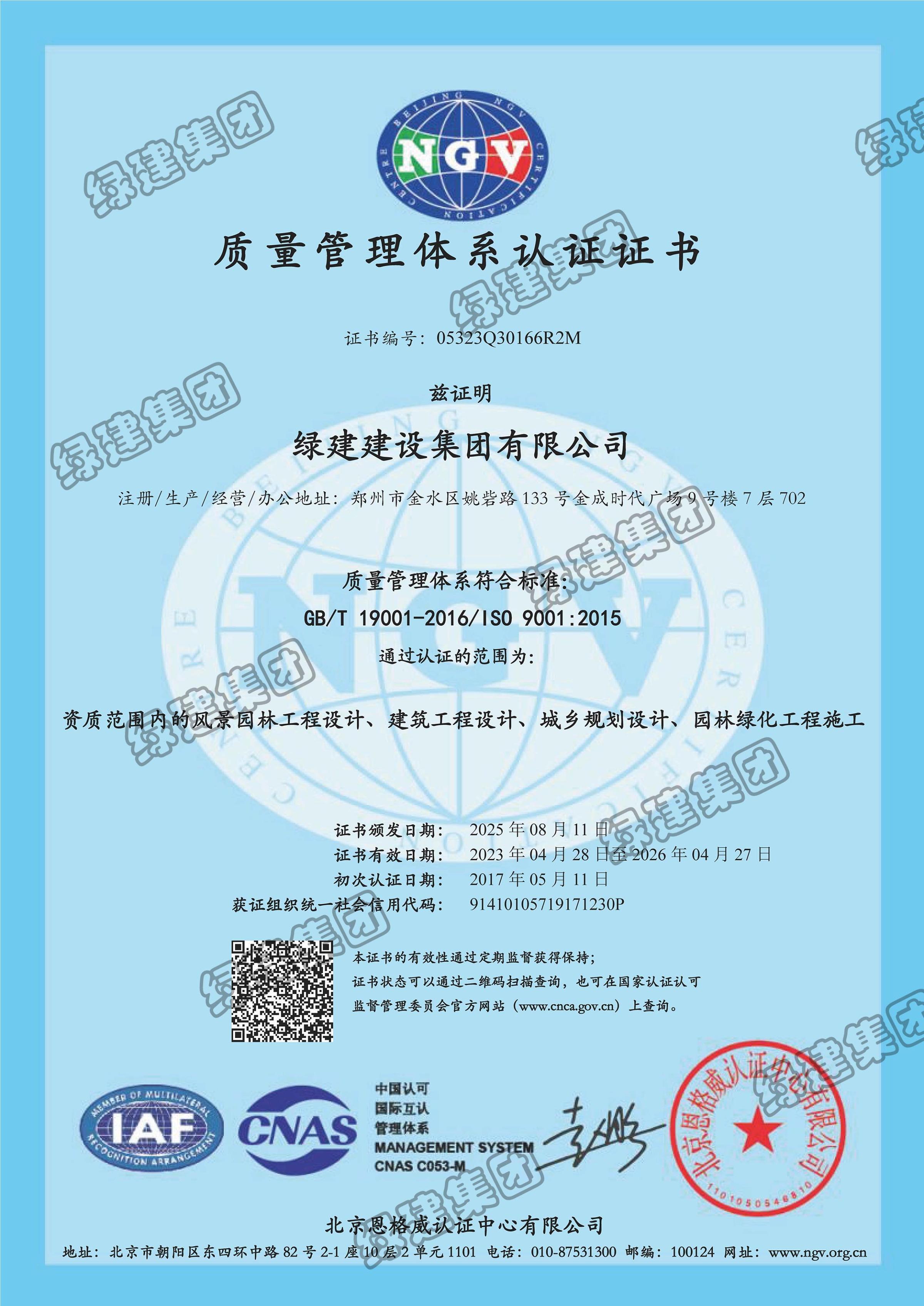 質量管理體系認證證書(園林綠化設計、建筑設計、城鄉規劃設計)